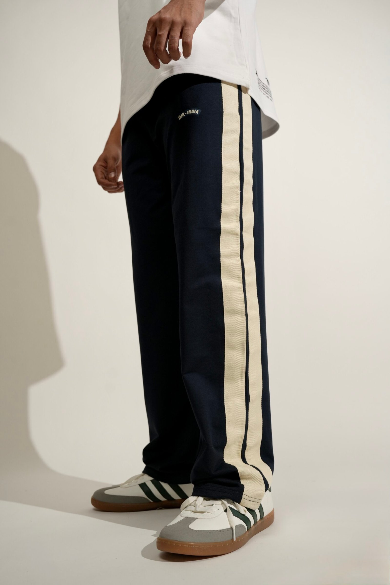 Designed for movement and everyday ease, the Navy Side Seam Drawstring Track Pants are made from 100% cotton for a naturally soft and breathable feel. Featuring contrast side seams, a relaxed silhouette, and an adjustable drawstring waist, these pants bring sporty versatility to your off-duty wardrobe.